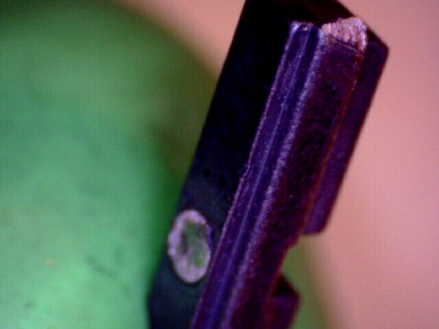 One of the most noticeable pieces of evidence from key bumping is damage to the face of the lock. This is caused by the shoulder of the key impacting the area above and below the keyway. The use of modified shoulders may prevent this from happening, see the Anti-Forensics page. |